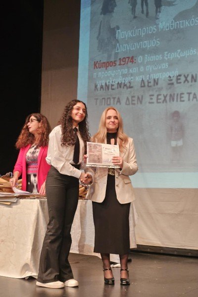 Διακρίσεις μαθητών/τριών του Σχολείου μας στον Παγκύπριο Μαθητικό Διαγωνισμό του ΥΠΑΝ με θέμα, «Κύπρος 1974: Ο βίαιος ξεριζωμός, η προσφυγιά και ο αγώνας για ελευθερία και επιστροφή». Η βράβευση πραγματοποιήθηκε στο Δημοτικό Θέατρο Λατσιών την Παρασκευή, 4 Απριλίου.