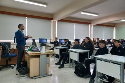 Στα πλαίσια εορτασμού της ελληνικής γλώσσας, φιλοξενήσαμε σήμερα στο σχολείο μας τον Επίκουρο Καθηγητή Γλωσσολογίας του Πανεπιστημίου Κύπρου, κύριο Σπύρο Αρμοστή. Παρουσίασε στους μαθητές μας τη διαδρομή της κυπριακής διαλέκτου, τη σχέση της με άλλες γλώσσες, καθώς και θέματα όπως αν ακούγονται ωραία τα κυπριακά, αν είναι χωριάτικη γλώσσα, πόσο πιο αρχαία είναι από άλλες γλώσσες, καθώς και πόσο καλύτερα μιλούμε οι Κύπριοι την αγγλική γλώσσα από τους Έλληνες. Οι μαθητές έδειξαν μεγάλο ενδιαφέρον και ανταποκρίθηκαν επαρκώς στα ερωτήματα και τους προβληματισμούς του καθηγητή.